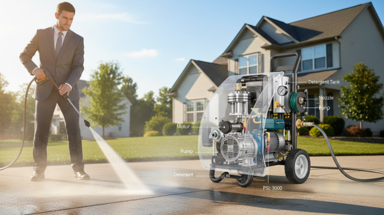 A pressure washer uses a motor or engine to pressurize standard garden hose water. That pressurized water is pushed through a narrow, specialized nozzle. You get a high-velocity jet capable of dislodging stubborn grime.